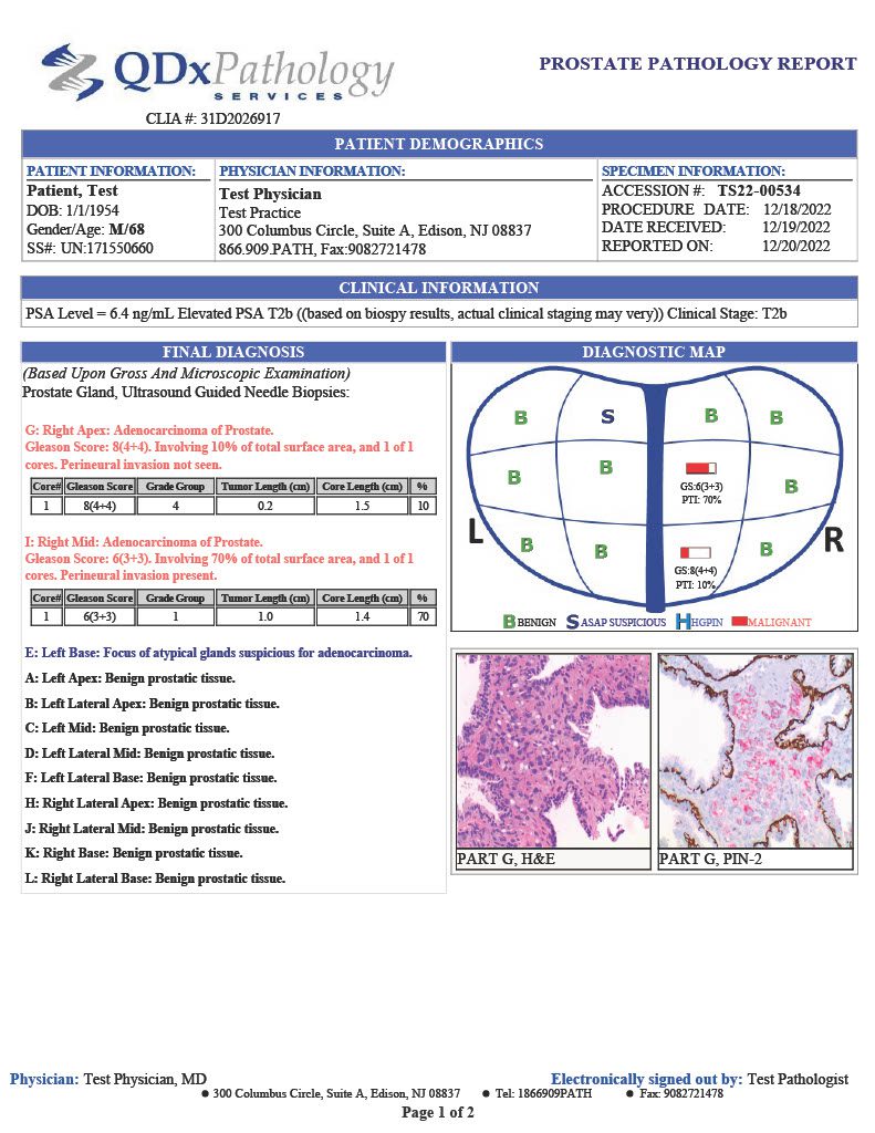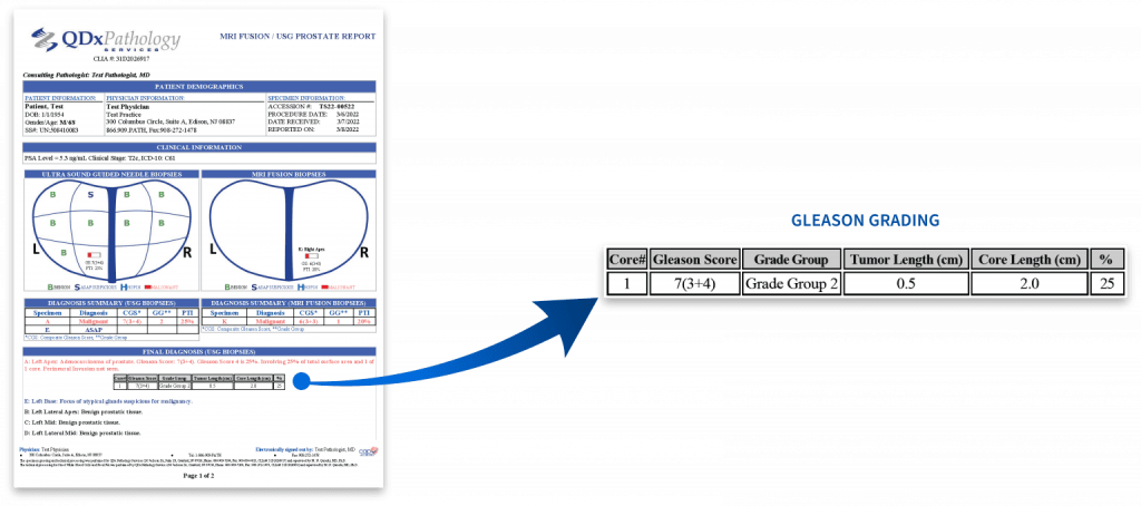 QDx includes a graphic representation of the biopsy sample locations with the associated interpretation of each part including ultrasound guided needle biopsies and MRI Fusion biopsies.