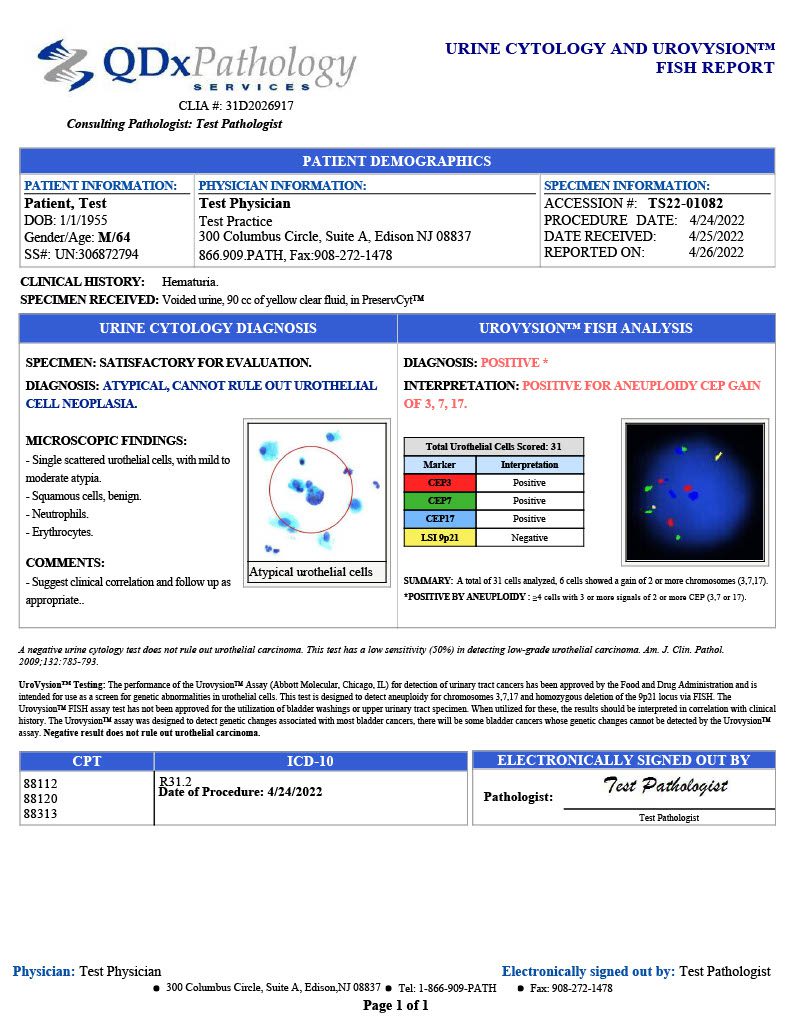 Patients with hematuria and suspected of having bladder cancer should be screened with FISH test as a complimentary procedure to a cytopathology examination. QDx utilizes the FDA approved Abbott UroVysion test kit to detect bladder cancer in urine. The fluorescence in situ hybridization assay utilizes fluorescently labeled DNA probes. The method quantifies aneuploidy chromosomes 3, 7, 17, and the loss of the 9p21 locus via fluorescence in situ hybridization (FISH) in urine samples.