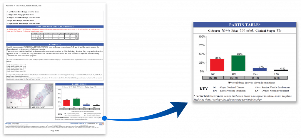 QDx includes a Partin table in its prostate pathology report which includes the clinical features of prostate cancer such as a Gleason score, serum PSA, and clinical stage to predict whether the tumor will be confined to the prostate. The tables are based on the accumulated experience of urologists performing radical prostatectomy at the James Buchanan Brady Urological Institute.
