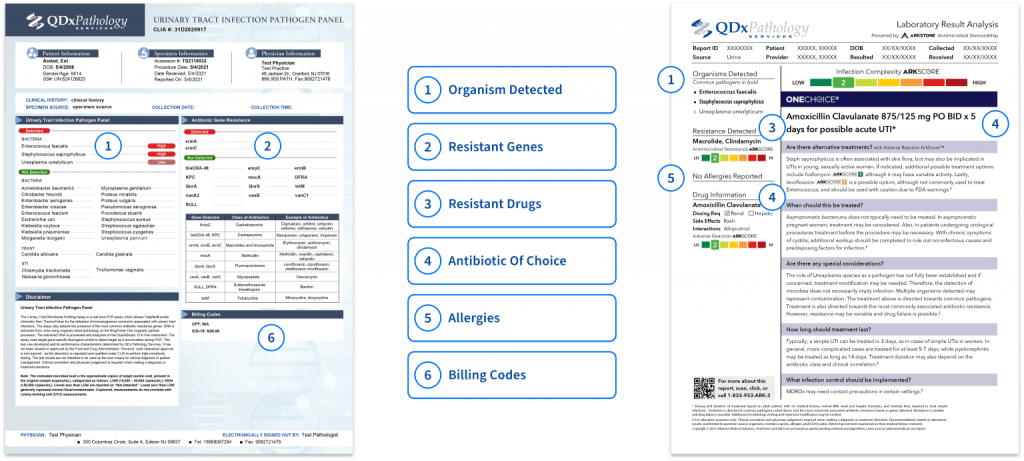 The UTI Pathogen panel report is presented in an easy-to-read format with color keys indicating if any pathogen resistant genes are detected and provides the recommended antibiotic.